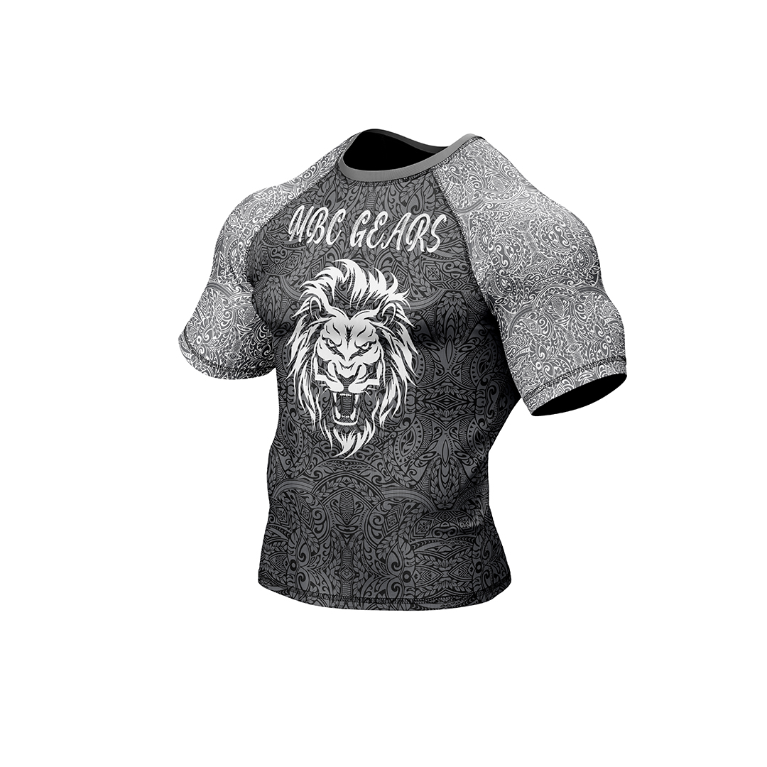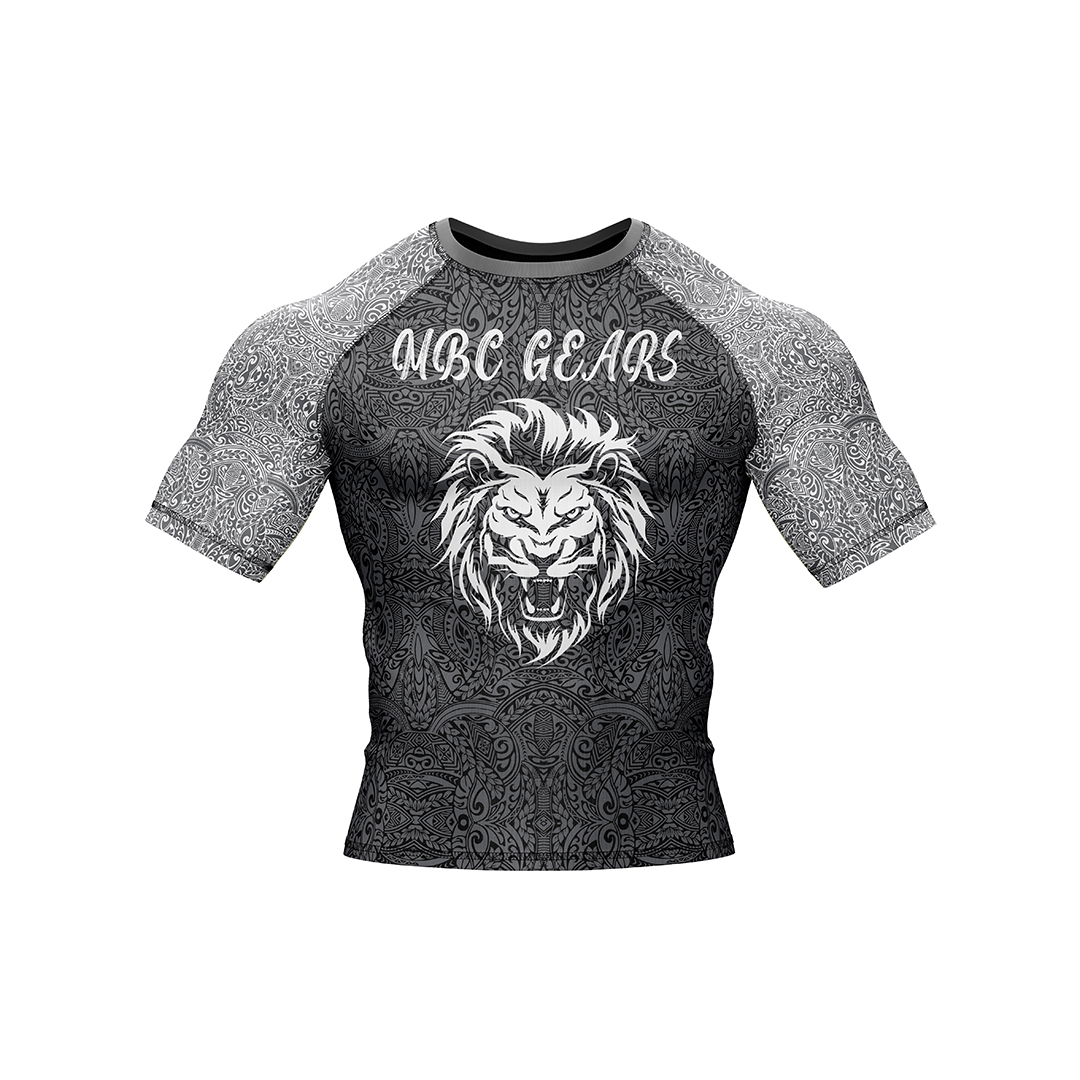 MBC GEARS ka premium “Lion Edition” rash guard aik bold aur stylish design ke sath aata hai jo aapke warrior spirit ko represent karta hai. Center mein ek roaring lion ka powerful graphic hai jo strength aur confidence ka symbol hai. Shirt ke dono sleeves aur base par intricate tribal patterns design ko ek unique aur attractive look dete hain.