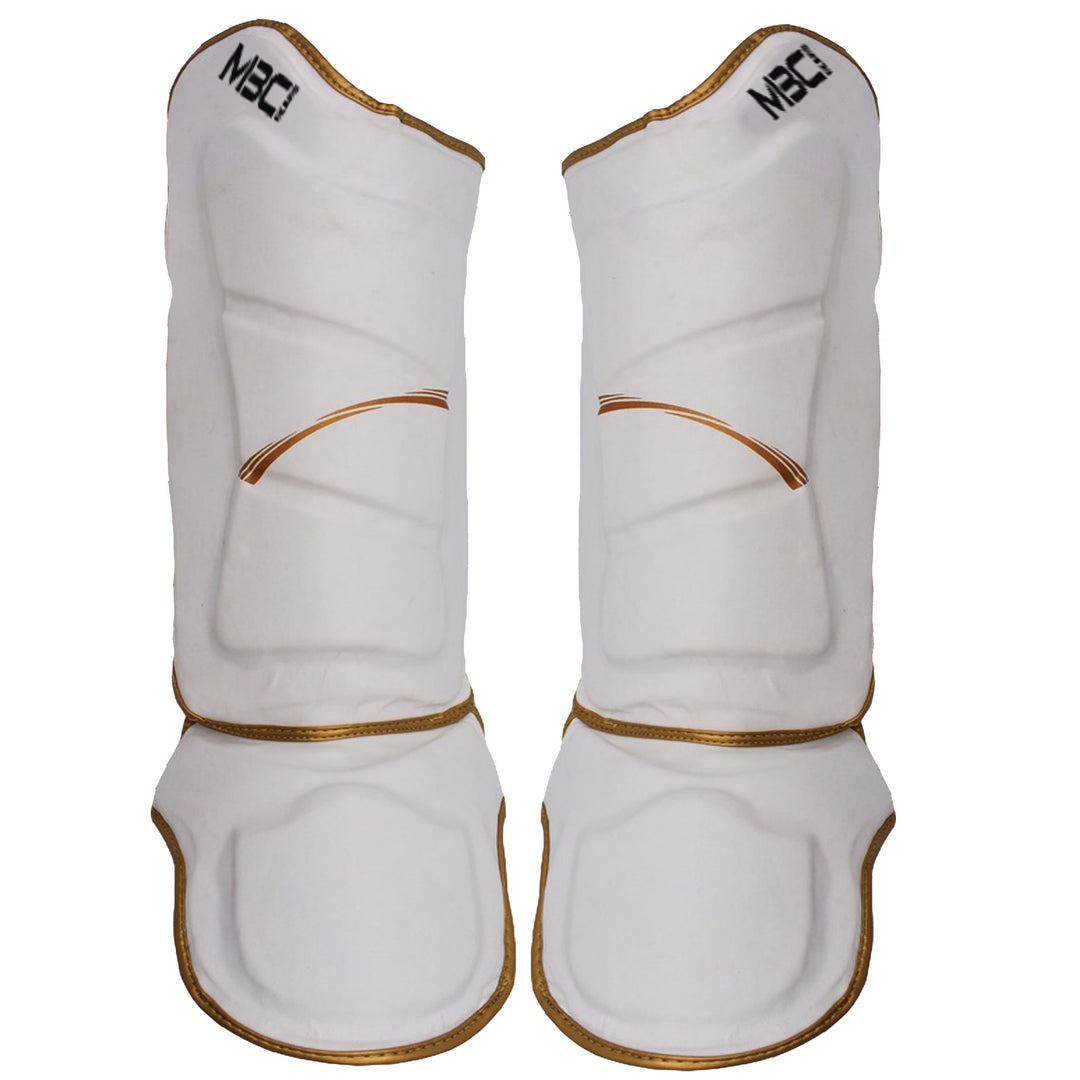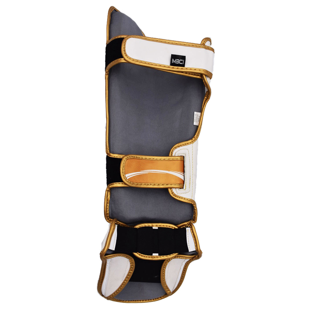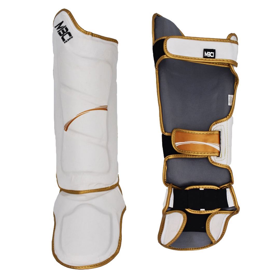 Protect your legs from harsh kicks and checks with MBC Gears’ premium shin and instep guards. Designed with fighters in mind, these guards provide excellent coverage for both the shin and the top of the foot without sacrificing mobility. The sleek white design with gold trim gives a professional look while offering maximum protection and comfort.